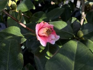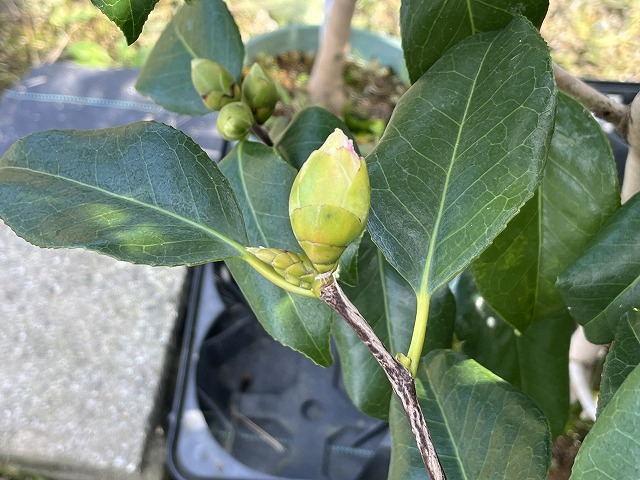 鉢植えの【参平椿・さんぺいつばき】の花が色付いています♪咲いていた花は鳥に食べられました・・・