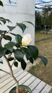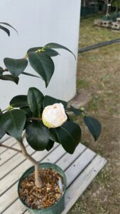 そんな厳寒期にこそ心強いのがこの白椿【毛利白玉・もうりしらたま】。冬の空気に負けず蕾が大きくふくらみ、ふっくらとした白花を見せてくれる“冬の味方”です。