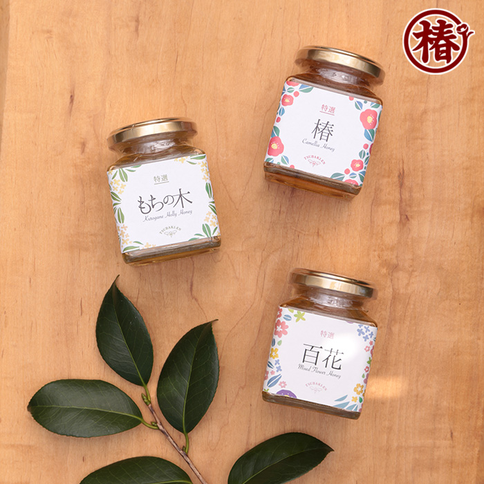 【商品内容】椿はちみつ200g・もちの木はちみつ500g・百花はちみつ500g 各1本