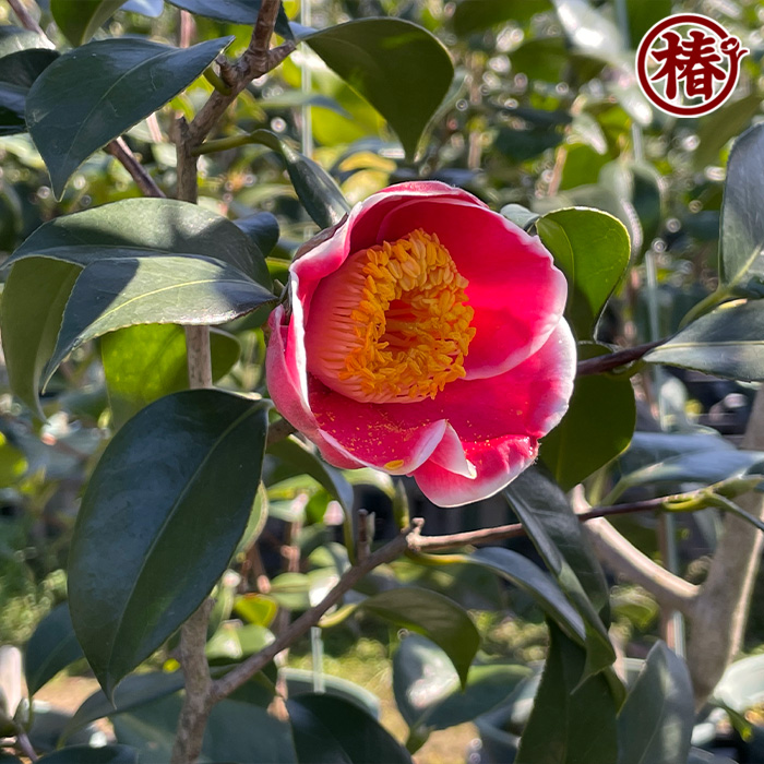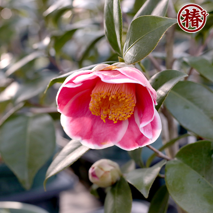 母樹である「玉之浦・たまのうら」は濃い紅色花弁と白覆輪のコントラストが美しく、今もなお人気を誇る椿です。花粉親である「加茂本阿弥・かもほんあみ」は蕾のふくらみが素晴らしく、うねりの少ない葉や上を向いて咲く花姿が切り花としても使いやすい椿です。