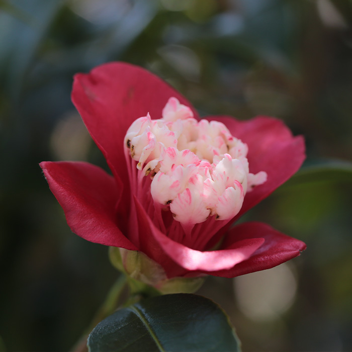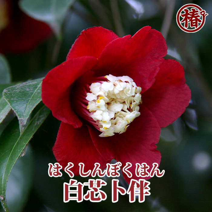 濃紅の花色に純白の花芯が印象的な園芸品種でとても人気のある花となっており、「卜伴・ぼくはん」や「月光・がっこう・げっこう」など地方により呼び名が変わる椿です。