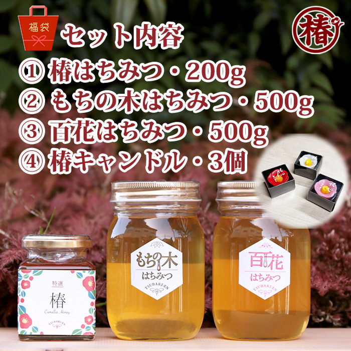 【商品名】2026新春福袋・10点限定 はちみつ3種+椿キャンドル3個+手提げ袋付き!