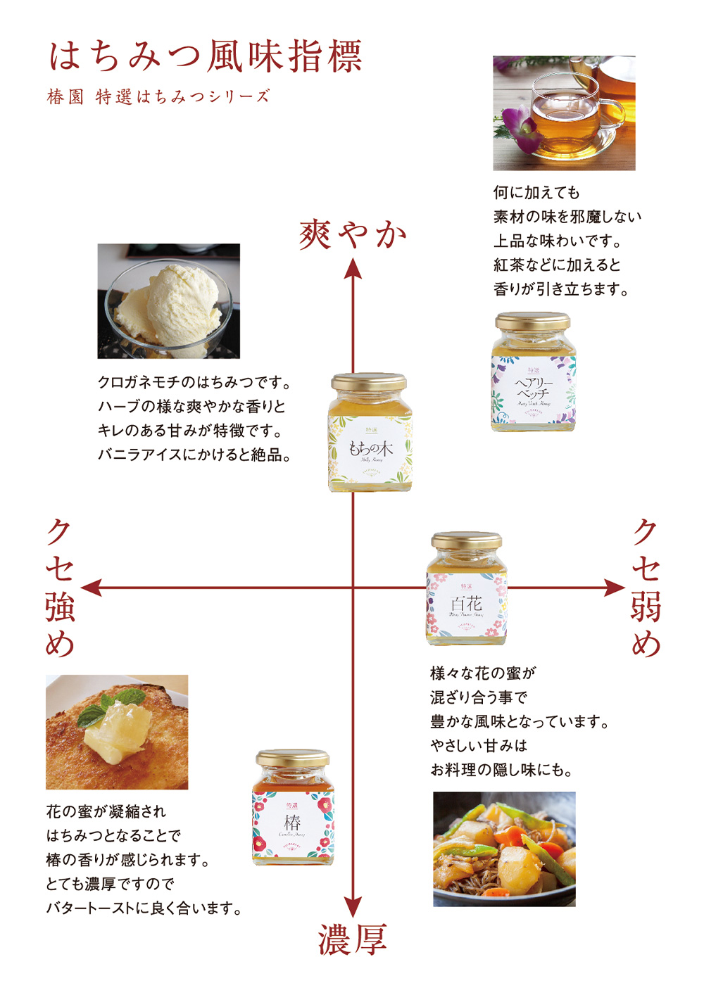 椿の咲く農園で採れた椿はちみつをはじめ、椿園ならではの個性豊かなはちみつをぜひこの機会に味わってみてください。