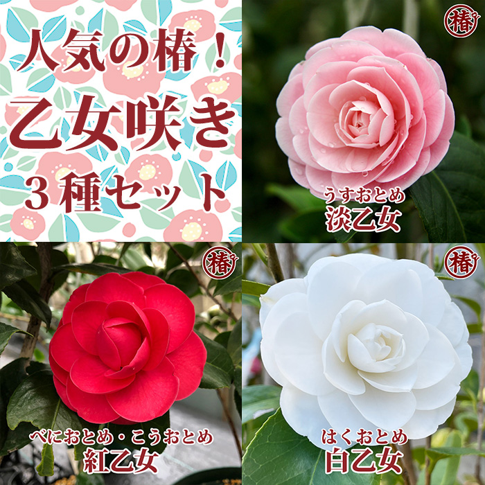 【特徴・魅力】大人気の乙女咲き椿、桃色・紅色・白色の可憐な3種類セットをお届けいたします。