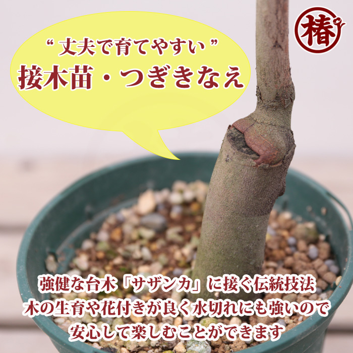強健で丈夫なサザンカ台木にツバキをつなぎ育てている「接ぎ木苗」ですので地植えにしても鉢植えのままでもしっかり育ちます。