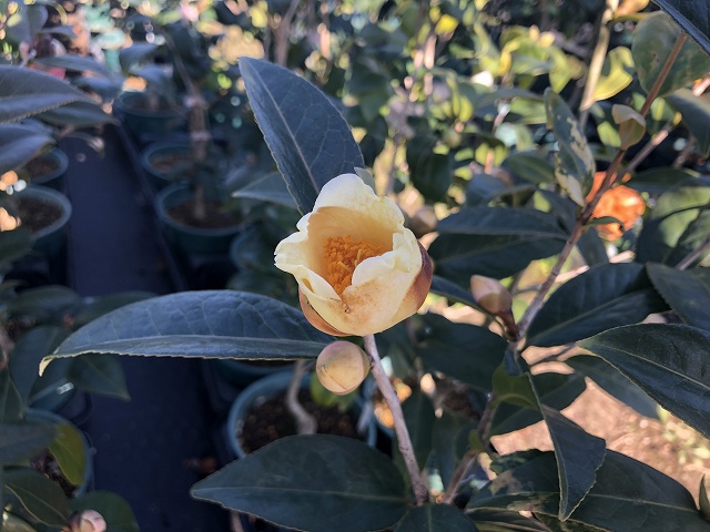 生産農園では黄色の椿「初黄・しょこう」が咲き始めました♪ 例年はクリーム色程度ですが、今年はしっかりと黄色の花が咲いています!