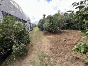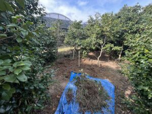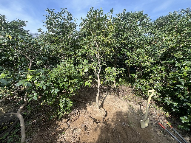 樹高2m~3m程、樹齢30年は超える椿一本一本を掘り上げ、根の状態に合わせて枝を透かしたり整える剪定をします。