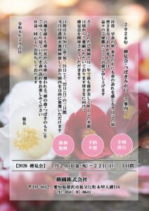 第10回記念の椿見会(3/20〜3/22)、お友達やお花が好きなみなさんで、一足早い”春のお花見”にぜひ遊びに来てください。皆さまのご来園を心よりお待ちしております。