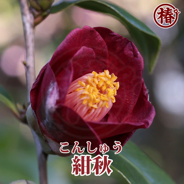 本日ご紹介する花は【紺秋・こんしゅう】色の濃い紅色の早咲きつばきです♪