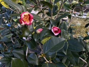 本日の鉢植え椿で咲いていた花は【ことじ】です!石川県金沢市にある日本三大名園(日本三名園)の一つ「兼六園・けんろくえん」のことじ(徽軫・琴柱)燈籠に由来します。