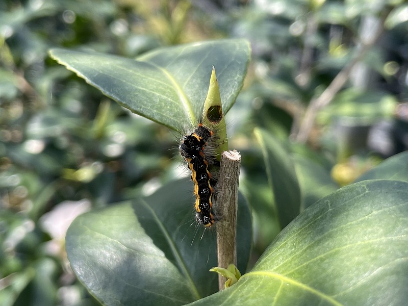 そんな新芽を見ていたら虫が・・・なんと【ゴマフリドクガ】(・・・と思われる)の幼虫がいました!!