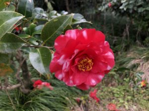 鮮やかな紅地に白斑が入る、美しく華やかな椿。