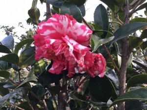 濃紅と純白のコントラストが美しく豪華に咲く椿ですが