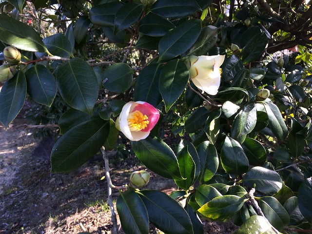 白の縦絞りを中心に、いろいろな花色が咲く咲き分け椿「尾張五色椿-おわりごしき-」です。