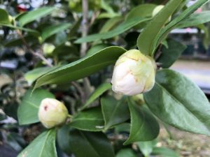 花径4㎝~6㎝程度で、葉と花のバランスが良くふっくらと玉状にさく上品な白椿です。