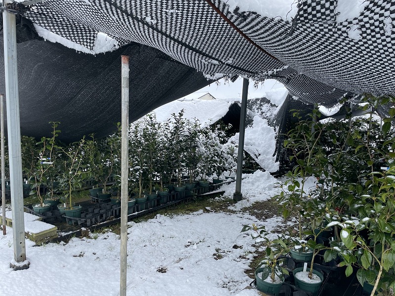 みなさんこんにちは!椿園の佐藤です。夜から朝への大雪、多くの寒冷紗が破れて苗木が下敷きになってしまいました。